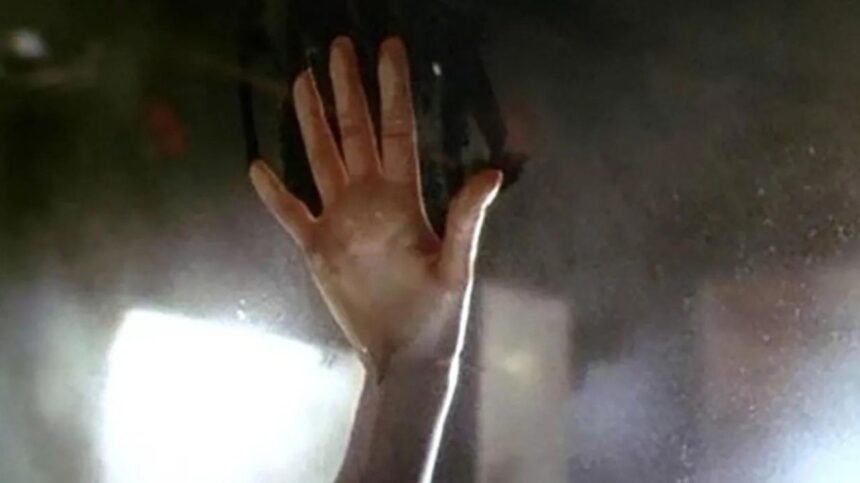 Pues depende del momento de la escena que veas, porque realmente hay dos planos distintos con la mano a diferente altura: en uno, el más conocido, Winslet pone la mano a media altura del cristal, pero en el plano siguiente está notablemente más abajo. En el fragor del momento y la calentura juvenil nadie se dio cuenta, pero con frialdad se puede ver claramente. Ups.