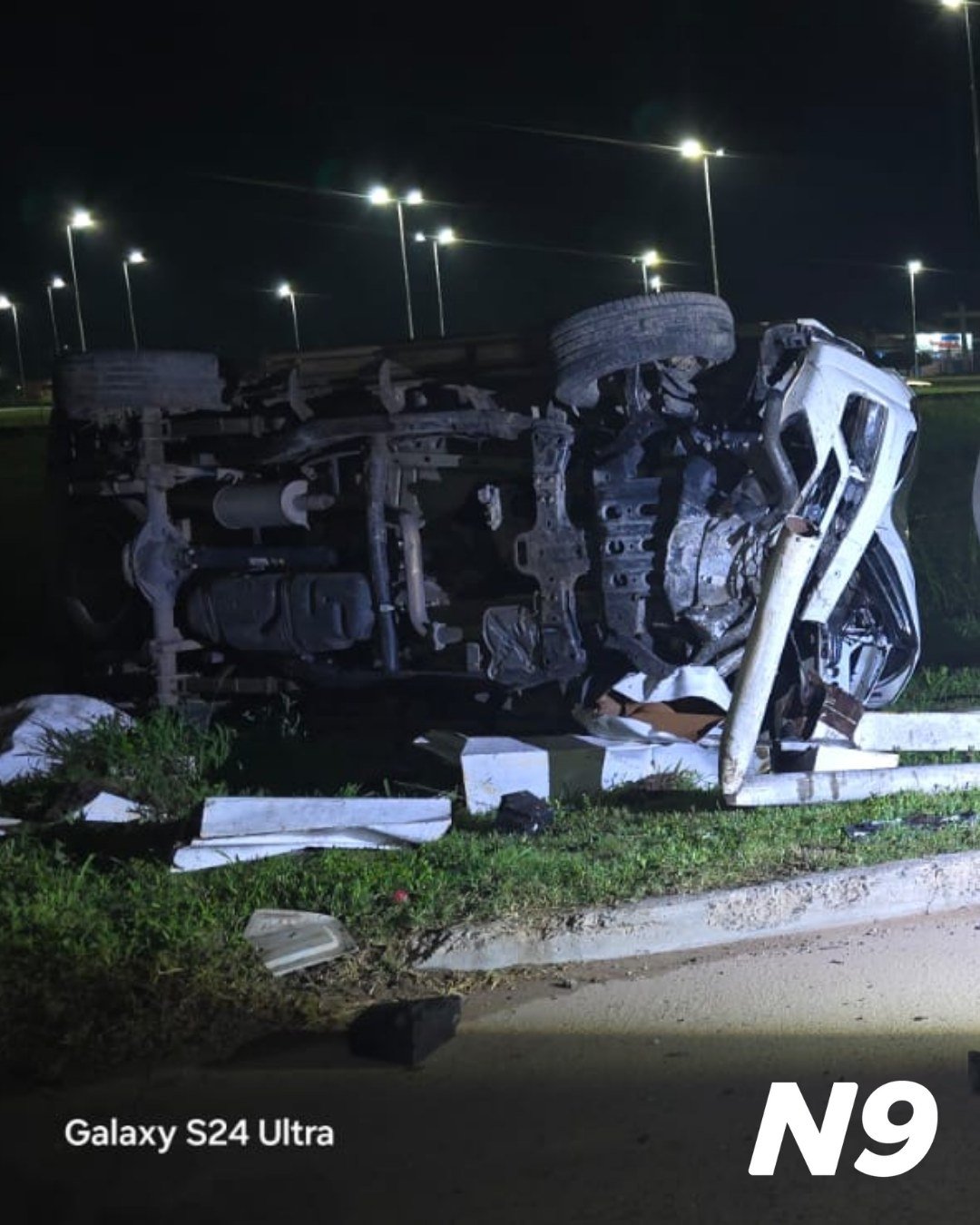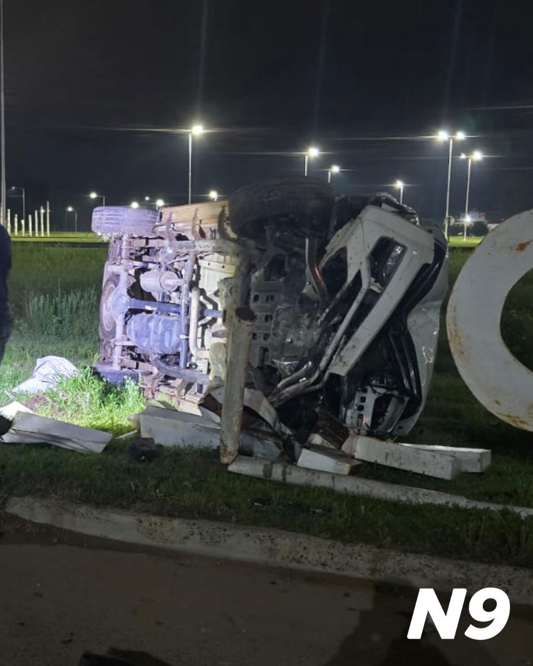 Un conductor perdió el control de su camioneta y impactó contra una jirafa de alumbrado y el cartel de la “Ciudad Termal” sobre Ruta 16 y Colectora Sur.