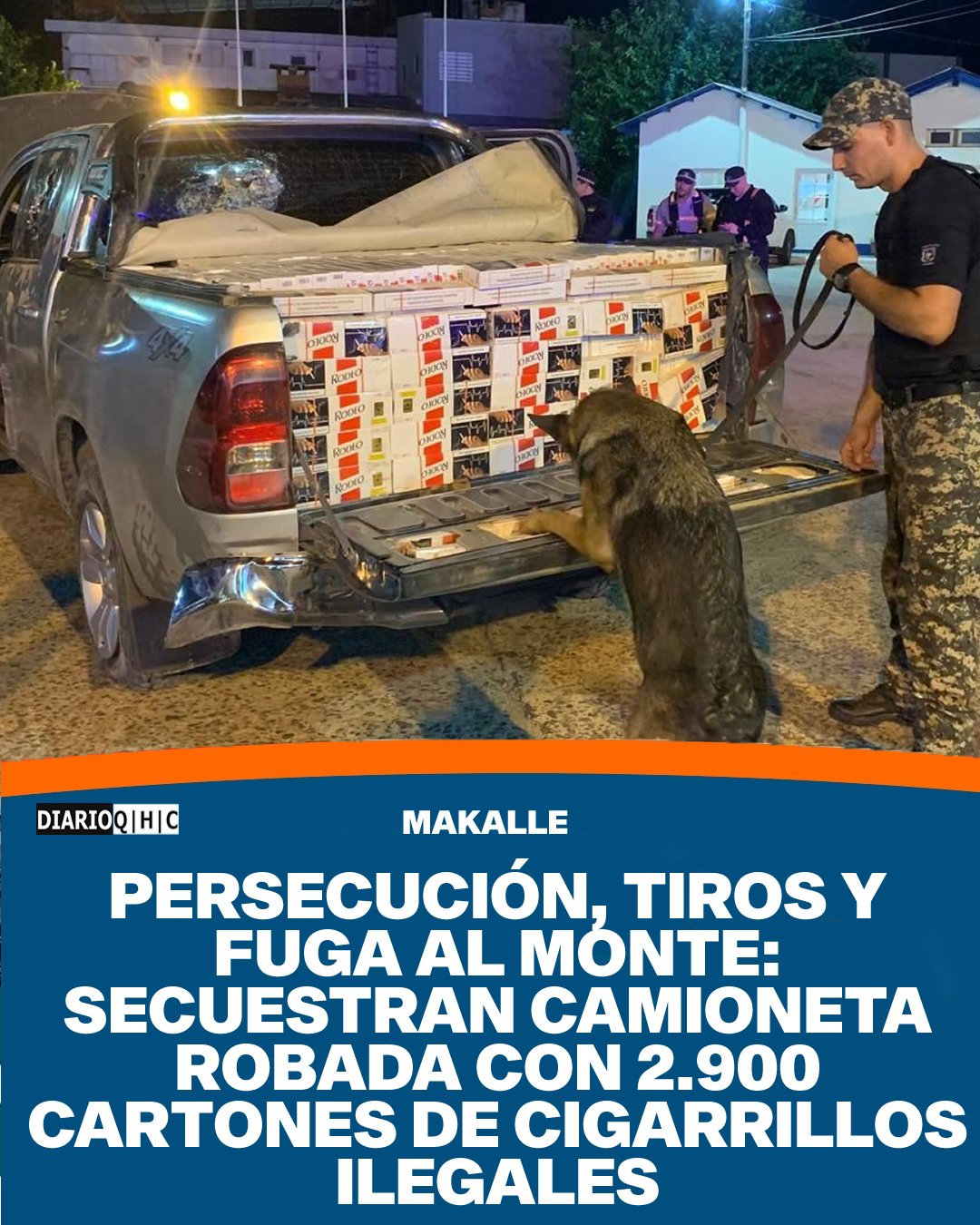 Una persecución policial se desató ayer por la tarde luego de que el conductor de una camioneta Toyota Hilux gris evadiera un control caminero en Makallé, sobre la Ruta Nacional 16. El operativo culminó con el secuestro del vehículo, que tenía pedido por robo, y una importante carga de cigarrillos de contrabando, mientras el sospechoso logró escapar internándose en el monte.