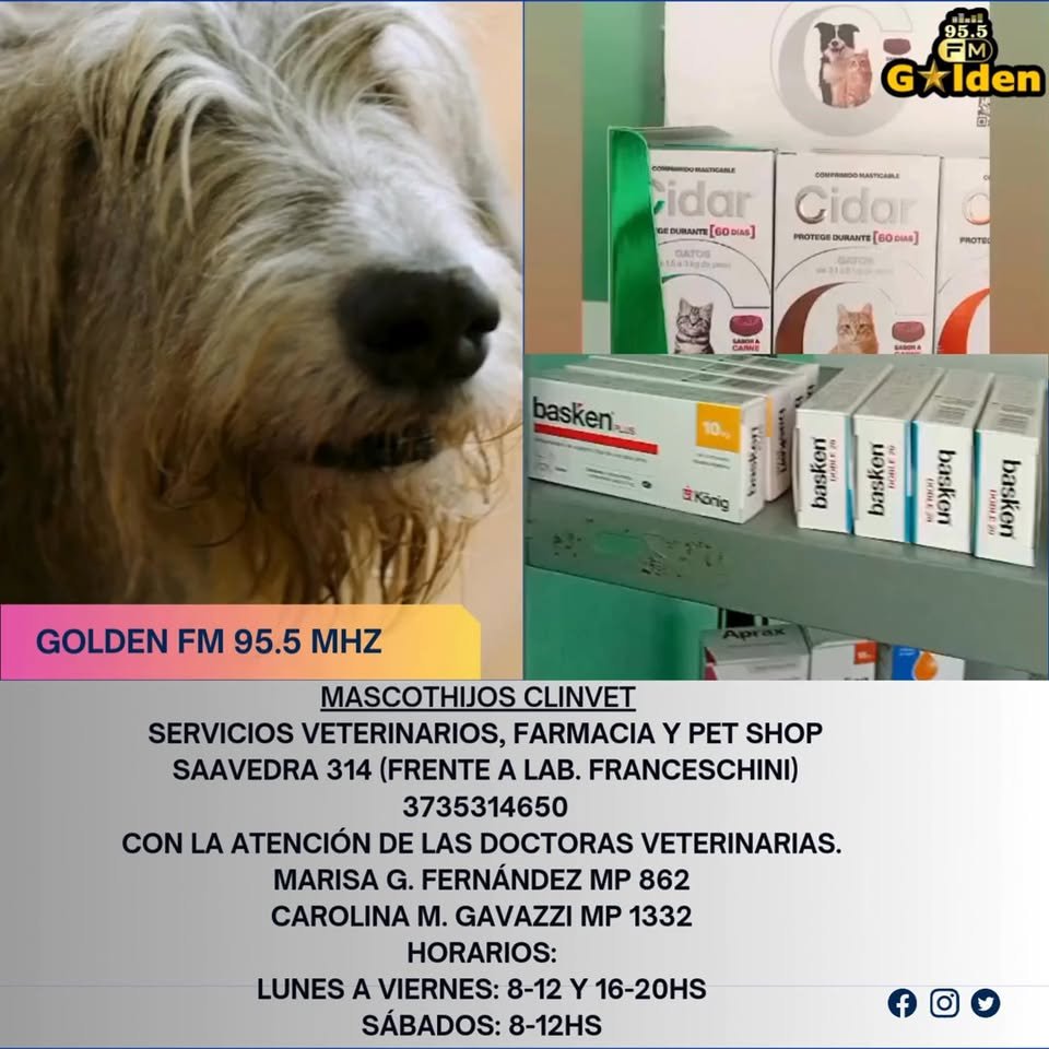 Golden Fm 95.5- Coronel Du Graty \nMascothijos ClinVet \n\n\ud83c\udfe5 Servicios veterinarios, farmacia y pet shop\n\ud83d\udccd Saavedra 314 (frente a Lab. Franceschini)\n\ud83d\udcde 3735314650\n\nCon la atenci\u00f3n de las doctoras Veterinarias. \n\ud83d\udc69\u200d\u2695\ufe0fMarisa G. Fern\u00e1ndez MP 862\n\ud83d\udc69\u200d\u2695\ufe0fCarolina M. Gavazzi MP 1332\n\nHorarios:\nLunes a viernes: 8-12 y 16-20hs\nS\u00e1bados: 8-12hs\n\nAlimentos balanceados:\n- Maxium\n- \u00dcnik\n- Agility\n- Sieger\n\nArt\u00edculos para mascotas:\n- Correas, collares, pretales\n- Ropa de abrigo\n- Colchonetas, moises y mantas\n- Kit sanitario y comederos\n\nFarmacia:\n- Pipetas antiparasitarias\n- Antibi\u00f3ticos y antiinflamatorios\n- Shampoos y colirios\n\n\u00a1Seguirnos en nuestras redes!\nIG y Facebook: \u0040mascothijosclinvet\n\n\u00a1Vis\u00edtanos y haz que tu mascota sea feliz! \ud83d\udc3e\u2764\ufe0f\»»,»delight_ranges»:[],»image_ranges»:[],»inline_style_ranges»:[],»aggregated_ranges»:[],»ranges»:[{«entity»:{«__typename»:»User»,»__isEntity»:»User»,»__isActor»:»User»,»id»:»100063763284233″,»url»:»https:\/\/www.facebook.com\/people\/Golden-Fm-955-Coronel-Du-Graty\/100063763284233\/»,»profile_url»:»https:\/\/www.facebook.com\/people\/Golden-Fm-955-Coronel-Du-Graty\/100063763284233\/»,»short_name»:»Golden Fm 95.5- Coronel Du Graty»,»work_info»:null,»__module_operation_CometTextWithEntitiesRelay_textWithEntities»:{«__dr»:»ProfileGeminiWeakReferenceLink_user$normalization.graphql